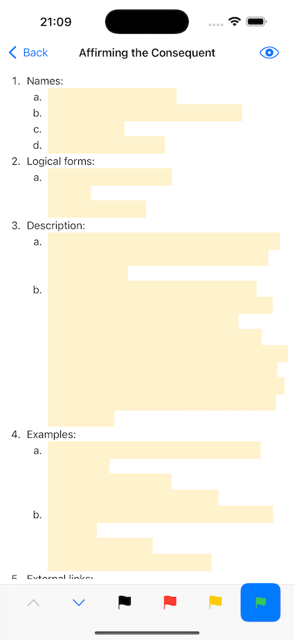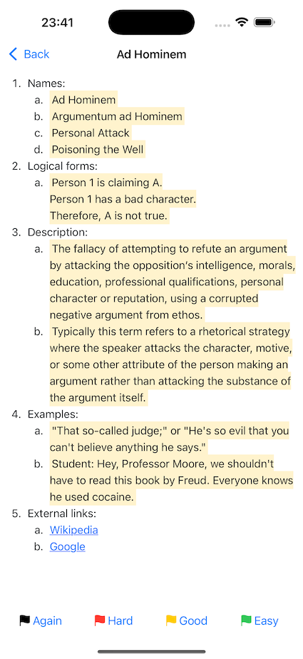 At the bottom of the ‘Study Fallacy Page’(see Figure 2) and ‘Fallacy Detail Page’(see Figure 3) page, there are four answer buttons: Again / Hard / Good / Easy, represented by black or white flag, red flag, yellow flag, and green flag, respectively.