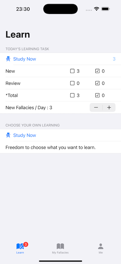 - ‘New Fallacies / Day’: refers to the number of new fallacies you need to learn each day. You can control the number of new fallacies you need to learn each day by modifying this setting.